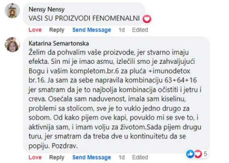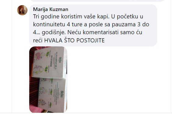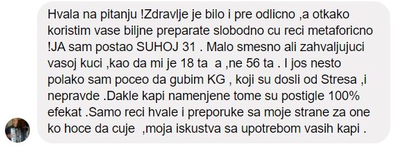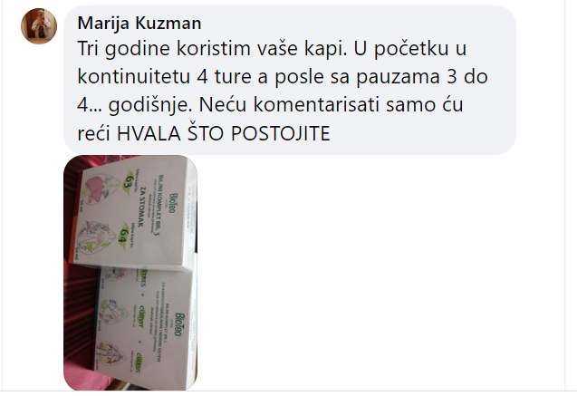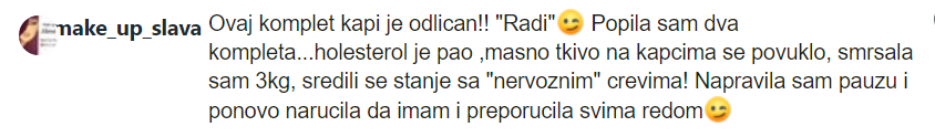 PREPORUČENA UPOTREBA PROIZVODA: Komplet sadrži 2 vrste biljnih kapi koje se uzimaju 2–3 puta dnevno po 30 kapi, rastvorenih u 30 ml (rakijska čašica) vode ili čaja. Može se dodati med i limun u mlak čaj. Redoslijed uzimanja kapi iz kompleta nije presudan. Osobama koje prvi put uzimaju proizvode koji čine komplet preporučuje se da koriste sljedeću šemu, do maksimalnih 30 kapi: