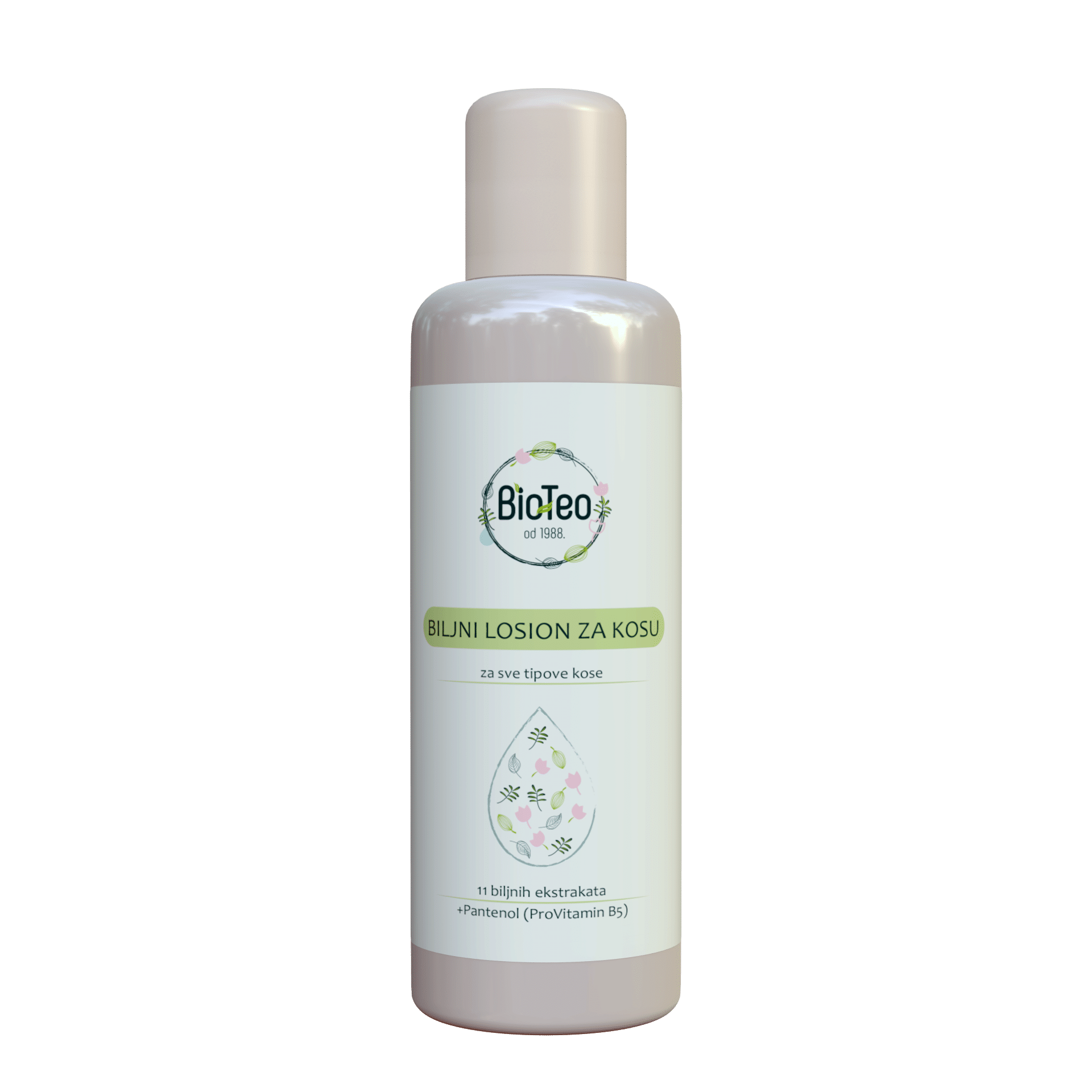 BIOTEO BILJNI LOSION ZA KOSU prirodni je losion izrađen po originalnoj recepturi na bazi ljekovitog bilja koji može pomoći u sprječavanju opadanja i mašćenja kose, kao i nastanku peruti i svraba. Losion može pomoći u održavanju pravilne periferne cirkulacije i stimulaciji rasta kose. Zahvaljujući ljekovitom bilju koje ulazi u njegov sastav, ovaj tonik osvježava kožu vlasišta, a vlasima može dati čvrstinu i elastičnost.