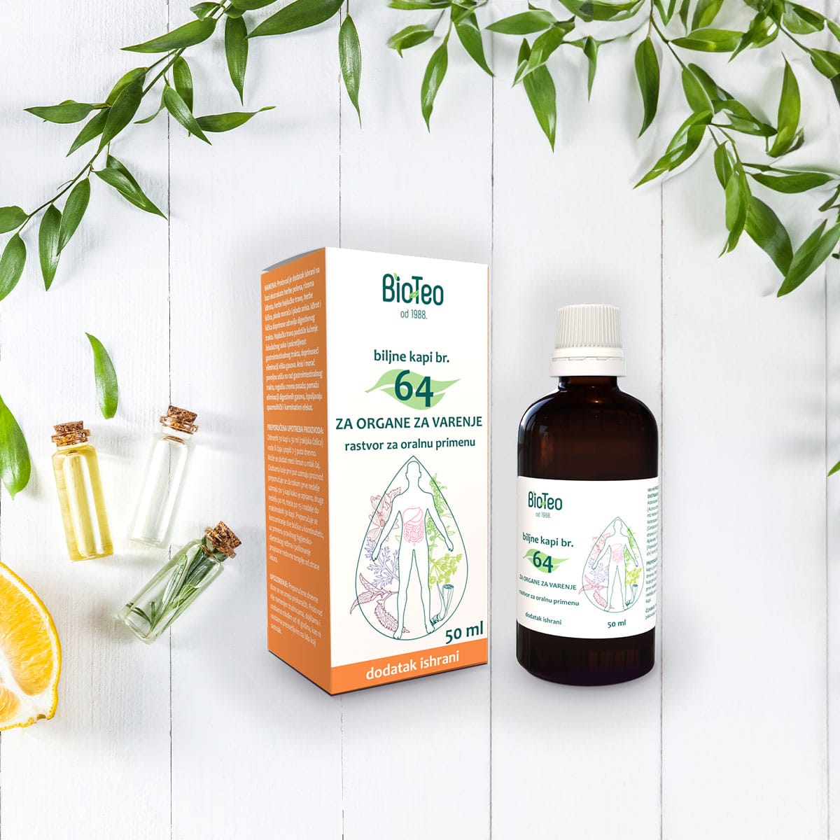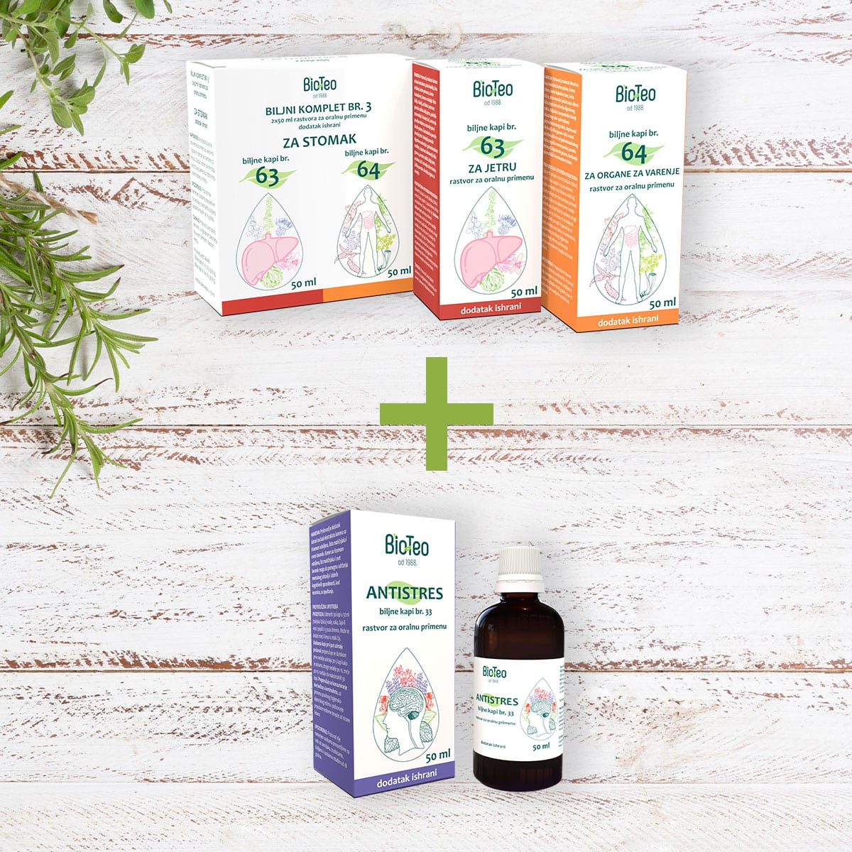 BIOTEO Biljni komplet br. 3 ZA STOMAK sadrži dvije vrste biljnih kapi – Biljne kapi br. 63 i Biljne kapi br. 64, namijenjene zdravlju stomaka i organa za varenje.